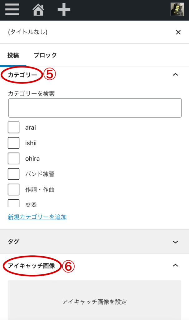 「カテゴリー」をタップするとカテゴリーのリストが出てくるので、チェックを入れてください。複数選択可能なので、自分の名前の項目と、投稿内容にあった項目を選んでチェックを入れる。現在は音楽関係のカテゴリーを適当に入れているだけなので、該当するものがリストになかったら、「新規カテゴリーを追加」で新しく作っちゃってください。