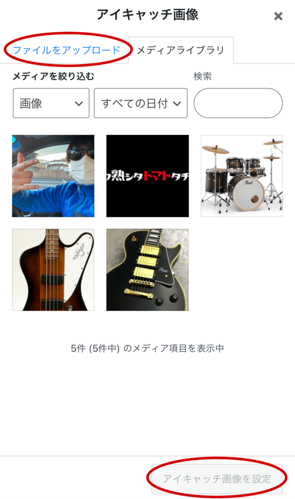 「ファイルをアップロード」 →「ファイルを選択」 →「写真ライブラリ」でスマホ内にある写真を選んで、上記メディアライブラリ画面からアップロードした写真を選択して、下部の「アイキャッチ画像を設定」ボタンを押せば完了です。